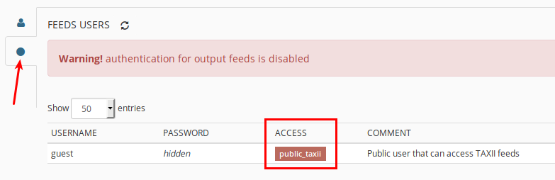 To do this first create a new feed user from ADMIN – FEED USERS page (guest/guest) then an access tag for the user (public_taxii). This is the tag to be “attached” to the output feed to set authentication.