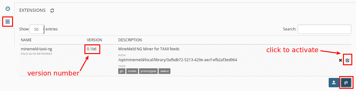 First of all we need to install the new miner extension. To do this go to System menu and click on Extensions button (left); then click on git button, add the address https://github.com/PaloAltoNetworks/minemeld-taxii-ng.git and click RETRIEVE.